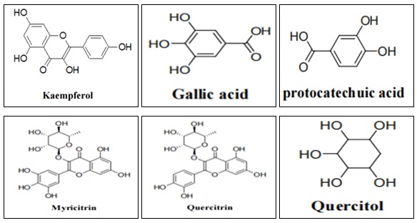 Polyphenols: Gallic acid, myricitrin, 3-4-di-ogalloylquinic acid, 2,4,6-tri-O-galloyl Dglucose, 1,2,3,4,6-penta-O-galloyl-β-D-glucose (Aqil.,1999 & Chen., 1991)