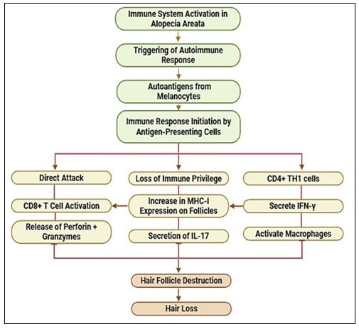 Immunity: Hair follicles possess a form of specialized immunity, but this is limited to the anagen phase 3. In AA, the immune system attacks hair follicles through two separate pathways. First, it directly attacks the follicles, an action triggered by autoantigens produced by melanocytes within the follicles. Second, it weakens the follicle’s natural protection by increasing MHC class I levels, which makes it easier for CD8+ T cells to spot and attack the hair follicle when autoantigens are present. Upon stimulation, these cells release perforin and granzymes, which work together to damage follicular keratinocytes and Perforin creates pores in target cell membranes, while granzymes trigger apoptosis. This process leads to hair follicle destruction and subsequent hair loss. Some CD8+ T cells later transition into memory T cells, persisting within the body and potentially causing repeated instances of AA 3.