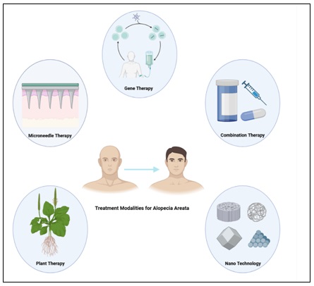 ABSTRACT: Alopecia areata (AA) is a chronic autoimmune disorder leading to non-scarring hair loss and affecting millions worldwide across all age groups. Despite extensive research, the precise molecular mechanisms remain incompletely understood, arising from complex interactions among immune dysregulation, genetic susceptibility, and environmental triggers. Emerging evidence also implicates lifestyle factors, psychological stress, gut microbiome imbalance, and drug exposures in disease onset and progression. This review synthesizes current knowledge on the immunopathogenesis of AA, integrating insights from T-cell mediated autoimmunity, genetic variations, and epigenetic regulation. Advances in diagnostic strategies, including trichoscopy, histopathology, and severity assessment tools, are critically evaluated with attention to their clinical applicability and limitations. Importantly, the therapeutic landscape of AA is rapidly evolving: beyond traditional approaches such as corticosteroids and minoxidil, recent progress in biologics, JAK inhibitors, regenerative strategies including stem cell and exosome-based therapies, nanotechnology, and microneedle-assisted delivery systems is reshaping treatment paradigms. By bridging mechanistic understanding with therapeutic innovation, this review highlights unmet clinical needs, emphasizes opportunities for precision and regenerative medicine, and outlines future directions toward achieving durable and patient-centered outcomes in AA.