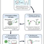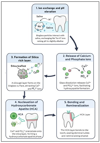 The Fundamental Mechanism of Bioglass Bioactivity: Bioglass is primarily a family of bioactive glasses composed of silicon dioxide, sodium oxide, calcium oxide, and phosphorous pentoxide. These materials exhibit both bioactivity and biodegradability, enabling the controlled release of therapeutic ions that modulate cellular responses. Owing to these properties, they are well-suited for diverse biomedical applications, including bone substitution and replacement, as well as the regeneration of both soft and hard tissues 23. Bioglass can be classified into three primary classes: silicate, borate, and phosphate Bioglass, based on the type of network-forming oxides. They can be synthesized using either the melt quenching method or the sol-gel method 24. Bioglass is typically composed of calcium sodium phosphosilicate, has revolutionized oral care by offering a unique mechanism as described in Fig. 1, that promotes healing and remineralisation of dental tissues. Its bioactivity stems from its ability to interact with bodily fluid like saliva which initiates a cascade of chemical reactions that result in the formation of a mineral layer similar to natural tooth enamel. When Bioglass is introduced into the oral environment, such as through toothpaste or dental treatments, it begins a multi-phase process as represented in Fig. 1.