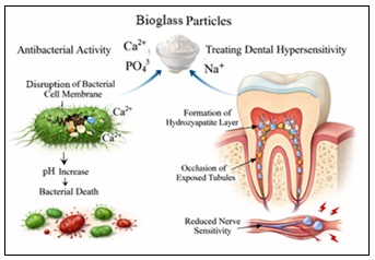 Systemic reviews and in-vitro studies report that when desensitizers like fluoride or gelatin modifications are added to the composition of Bioglass, there is significant reduction in long-term and short-term symptoms of DH 46. The clinical applications of Bioglass in treating dentin hypersensitivity (DH) include its use in toothpastes, desensitizing treatments, and restorative materials. One well-known formulation of Bioglass is NovaMin, which is widely used in dentistry. Studies have shown that NovaMin-containing toothpastes can significantly reduce sensitivity within a few weeks of use, often outperforming traditional agents like potassium nitrate 47. Moreover, Bioglass has shown antimicrobial properties, contributing to improved gingival health and reduced plaque accumulation, which indirectly benefits DH management 48. The Fig. 3, shows the antibacterial effect of Bioglass on remineralisation and treating hypersensitivity 49.