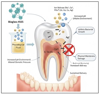 Caries Prevention and Remineralisation: Bioglass possesses exceptional antimicrobial properties that are valuable in biomedical applications. Its action is mainly due to the release of ions like Na⁺, Ca²⁺, and PO₄³⁻ in physiological fluids, raising local pH and creating an alkaline environment that inhibits bacterial growth. This ionic release also alters osmotic pressure around microbial cells, causing dehydration and cell lysis 66. Furthermore, Bioglass can physically damage bacterial membranes, leading to cell death. Therefore, its activity is enhanced by doping with antimicrobial metal oxides such as zinc, cobalt, and copper, with combinations resulting in synergistic effects that can be up to 100 times more effective. Silver-doped Bioglass exhibited both bacteriostatic and rapid bactericidal activities. Furthermore, the porous structure of this biomaterial facilitates the controlled release of metal ions, allowing for a sustained delivery of the antibacterial agent to dental materials 67. Prevalence of various Enterococcus species have been reported in the oral cavity 68.
