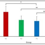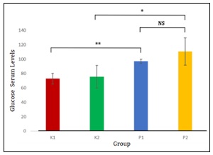 Independent t-test Sig. 2 tailed for the glucose serum level show significant level compare to control, but not P1 and P2 group. K1 and P1 t-test result is (0.001), K2 and P2 (0.029). There is no significant different from Mann-Whitney analysis for P1 and P2 result is (0.386). The independent t-test results are shown in Table 4, and the differences in serum glucose levels are presented in Fig. 2.