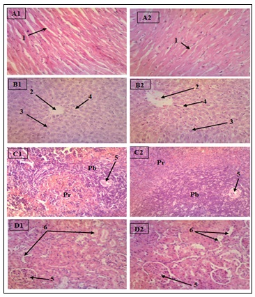 FIG. 1: HISTOLOGICAL SECTIONS OF THE HEART, LIVER, SPLEEN AND KIDNEY FOR THE TOXICITY TEST (GX100). A1: Witness heart; A2: Heart treated; B1: Control liver; B2: Treated liver; C1: Control spleen; C2: Treated spleen; D1: Control kidney; D2: Treated kidney; 1: Cardiac muscle fibers; 2: Centrilobular vein; 3: Kupffer cell; 4: Radiated sinusoidal capillary; 5: Malpighian corpuscle; 6: Contoured tubes; Pb: White pulp; Pr Red pulp.