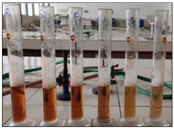 Foaming Ability and foam Ability: The cylinder shake method was employed to assess foaming capacity. A 250 ml graduated cylinder was filled with 50 ml of the 1% shampoo solution, and the cylinder was shaken ten times while being covered with a hand. The total volumes of the foam contents after 1-minute shaking were recorded.