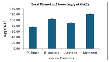 Determination of Total Phenol and Flavonoid Content: Initially for the experimentation six solvents were selected depending upon their polarity. On the basis of results obtained from extractive value and preliminary phytochemical analysis only four solvents selected viz., methanol, acetone, ethyl acetate and petroleum ether for the phenol and flavonoid estimation and also for in-vitro DPPH antioxidant assay. For the other in-vitro antioxidant assays and HR-LCMS analysis only methanol extract was used as maximum metabolites were identified in the preliminary analysis.