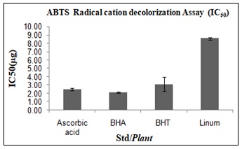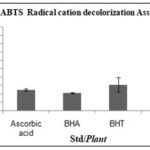 ABTS•+(2, 2-azinobis (3-ethylbenzothiazoline-6-Sulfonic Acid) Radical Scavenging Assay: The ABTS•+ scavenging activity of the plant extracts was assessed by first generating the ABTS radical cation (ABTS•+) by mixing 7mM ABTS with 2.45mM potassium persulfate in deionized water, allowing it to sit at room temperature for 12-16 hours. The absorbance of the ABTS•+ solution was then adjusted to 0.750±0.005 at 734nm. Next, 3mL of methanol and 1mL of the ABTS•+ solution were added to 2, 4, 6, 8, and 10µg of plant extract. After a 10-minute incubation at room temperature, the absorbance of the decolorized/scavenged ABTS•+ was measured at 734nm using a blank containing only methanol 20. IC50 values were calculated alongside those for ascorbic acid, BHA, and BHT.