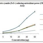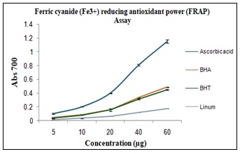 FRAP (Ferric Ion Reducing (Fe3+ → Fe2+) Antioxidant Power) Assay: The FRAP assay for formation of intense Perl’s Prussian blue complex of the Fe2+ - ferricyanide complexes from yellow coloured Fe3+ - ferricyanide complexes by the reducing power of plant extract was also performed [18]. Briefly, different concentrations of plant extracts (5, 10, 20, 30, 40 and 60µg) was taken and reacted with 2.5mL of 1% potassium ferricyanide in 2.5mL sodium phosphate buffer (0.2M; pH 6.6) and incubated at 50°C for 20minutes. Then 2.5mL of 10% trichloroacetic acid was added. 2.5mL of this reaction mixture was taken then diluted with 2.5mL distilled water and 0.5mL of 0.1% ferric chloride was added. The absorption of the complex was measured at 700nm 21.