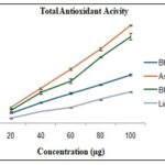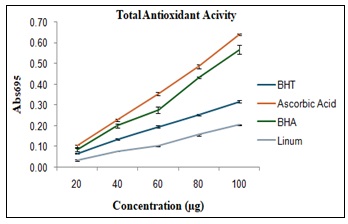 Phosphomolybdenum Method for Total Antioxidant Activity (TAA): In this method different concentrations of plant extract (20, 40, 60, 80 and 100µg) were reacted with 5.4mL phosphomolybdenum reagent, made up of 28mM sodium phosphate, 4mM ammonium molybdate and 0.6M sulfuric acid. The reaction mixture was then incubated at high temperature of 95°C for 90min, cooled at room temperature and subsequently the absorbance of green phosphate/Mo(V) complex formed was noted at 695nm 22.