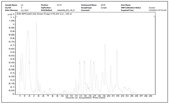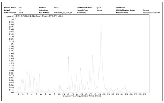 ABSTRACT: This study investigates the antioxidant properties and chemical composition of Linum usitatissimum L. (flaxseed) extract using High Resolution-Liquid Chromatography Mass Spectrometry (HR-LCMS) analysis. The primary objective is to identify the bioactive compounds responsible for the antioxidant activity and evaluate the efficacy of flaxseed extracts prepared with different solvents, including methanol, ethanol, acetone, chloroform, petroleum ether, and ethyl acetate. Methodologically, the study employs various antioxidant assays such as DPPH, ABTS, FRAP, and total Antioxidant Activity (TAA), in conjunction with HR-LCMS analysis for comprehensive chemical profiling. Key findings reveal that methanolic and ethanolic extracts exhibit the highest antioxidant activities, with significant amounts of phenolic and flavonoid compounds identified. The HR-LCMS analysis further elucidates the presence of metabolites such as adenosine, abscisic acid glucose ester, and kaempferol 7-O-glucoside, which contribute to the observed bioactivity. The study concludes that flaxseed extracts, particularly those obtained with methanol and ethanol, possess substantial antioxidant potential, underscoring their potential application in nutraceuticals and functional foods.