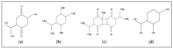 FIG. 2: STRUCTURES OF THE MAJOR BIOACTIVE CONSTITUENTS OF NIGELLA SATIVA: (a) thymoquinone, (b) thymohydroquinone, (c) dithymoquinone, and (d) thymol 8