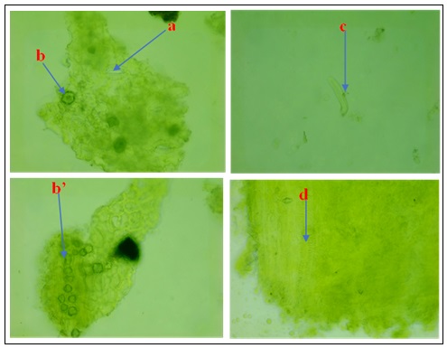Micrograph of M. oleifera leaves powder revealed the presence of anomocytic stomata (a), calcium crystals (b and b’), single-celled covering hairs (c) and spiral vessels (d) (see Fig. 1). These botanical characteristics of M. oleifera leaf powder will contribute to their identification and the determination of falsifications.