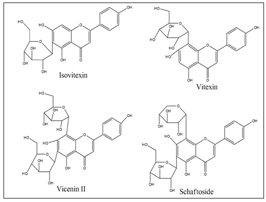 3. | P. alba flour | Vicenin II/Isomer, Isoschaftoside, Isoschaftoside hexoxide | [41] |