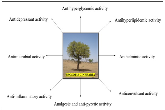 Pharmacological Activities of Prosopis cinneria: Prosopis cineraria plant plays an important role in showing various pharmacological activities. Fig. 4 represents the role of Prosopis cineraria in various therapeutic activities.