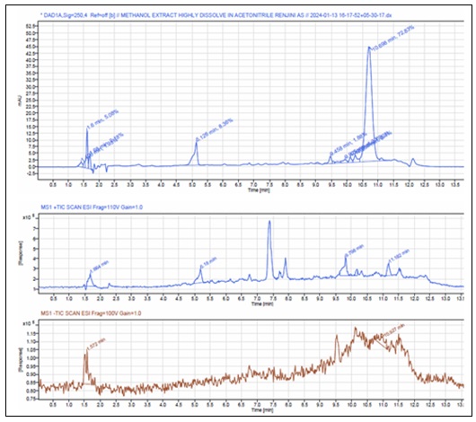 LC-MS 20: Spectroscopic and chromatographic methods are one of the basic and reliable methods to identifying pharmaceutically active biomolecules from the natural sources. LC-MS (Liquid chromatography -mass spectroscopy) are the sophisticated instruments which are used to screening of bioactive secondary metabolites from the natural sources. These methods are simplest, fastest and more acceptable methods for the identification of bioactive molecules from crude extract of the medicinal plants and which only needs a small amount of plant extract. In order to detect and identify the phytochemical components present in the medicinal plant, the LC-MS technique was used in the current investigation.