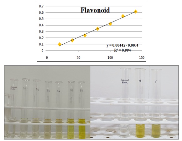 Principle: Total flavonoid content was measured by the aluminum chloride colorimetric assay. The basic principle of Aluminium chloride colorimetric method is that Aluminium chloride forms acid stable complexes with the C-4 keto group and either the C-3 or C-5 hydroxyl group of flavones and flavonols. In addition, it also forms acid labile complexes with the ortho-dihydroxyl groups in the A- or B-ring of flavonoids.