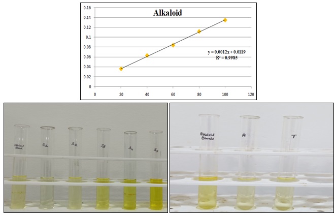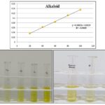 Principle: Total alkaloid is estimated based on the reaction with Bromocresol Green (BCG). In this method alkaloid and bromocresol green (BCG) reacts to form a yellow complex and is easily extractable using chloroform. The principle is that certain organic solvent can extract the colored complex (ion pair) quantitatively, which is the combination of an acid dye and a salt ion formed by the reaction of alkaloids and hydrogen ions under some acidic conditions. Chloroform is the most commonly used organic solvent for the determination of alkaloids, having the advantages of forming hydrogen bonds with ion pair easily, high extraction rate, good selectivity and poor aqueous solubility.