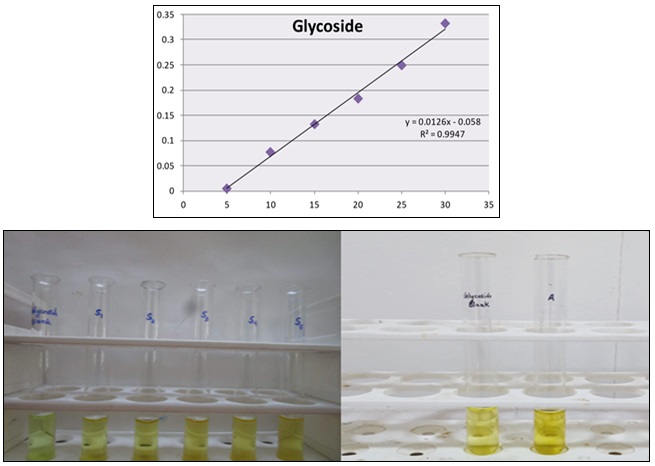 Principle: Cardiac glycosides develop an orange red colour complex with Baljet’s reagent (Picric acid in alkaline medium). The intensity (absorbance) of colour produced is proportional to the concentration of glycosides.Cardiac glycosides were quantitatively determined according to Solich et al. by some modifications.