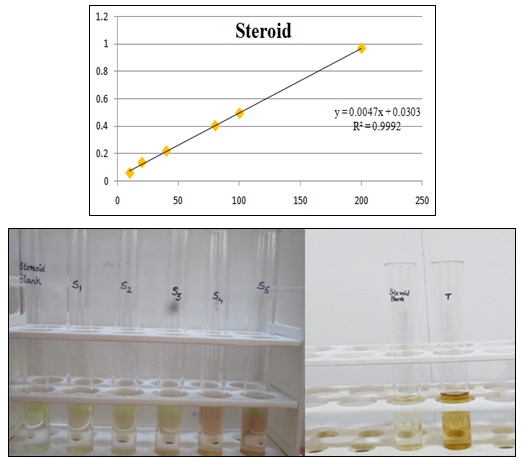 Procedure: One mg/ml of extract was taken in a clean test tube. Cholesterol was used as standard and was taken at varying concentrations of (1-10µg/ml) in test tubes. To the standard and test samples, 5ml of ferric chloride reagent and 4ml of concentrated sulphuric acid were added. The reaction mixtures were incubated at room temperature for 30 minutes and OD was read at 540nm. A standard graph was plotted from which the unknown value of steroid in the test sample was determined.